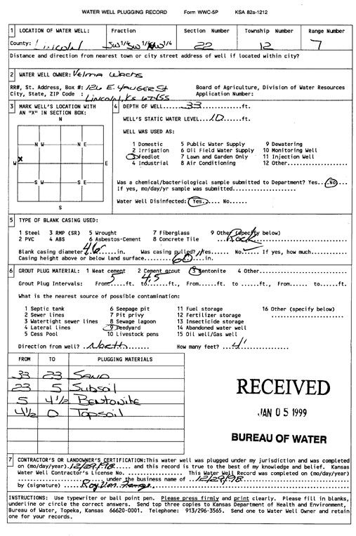 Wachs, Velma | 33 ft. | 10 ft. | Domestic, Livestock | Plugged | 29-Dec-1998 | Scan | ||