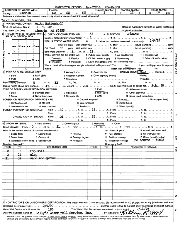 Buttenhoff, Keith | 52 ft. | 4 ft. | 30 gpm. | Domestic | Constructed | 09-Feb-1999 | Scan | |
