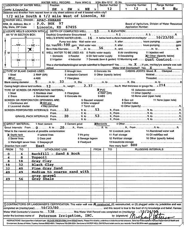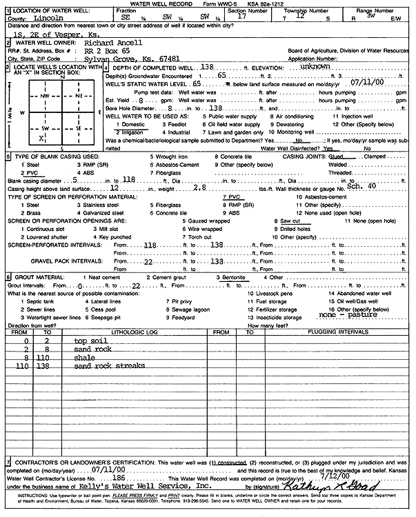 Ancell, Richard | 138 ft. | 65 ft. | 8 gpm. | Domestic | Constructed | 11-Jul-2000 | Scan | |