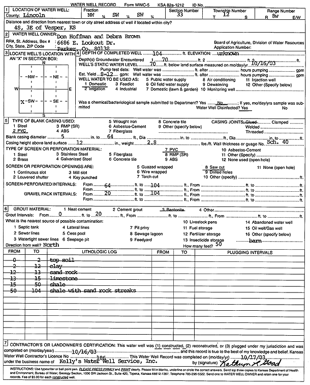 Hoffman, Don/Brown, Debra | 104 ft. | 70 ft. | 10 gpm. | Domestic | Constructed | 16-Oct-2003 | Scan | |