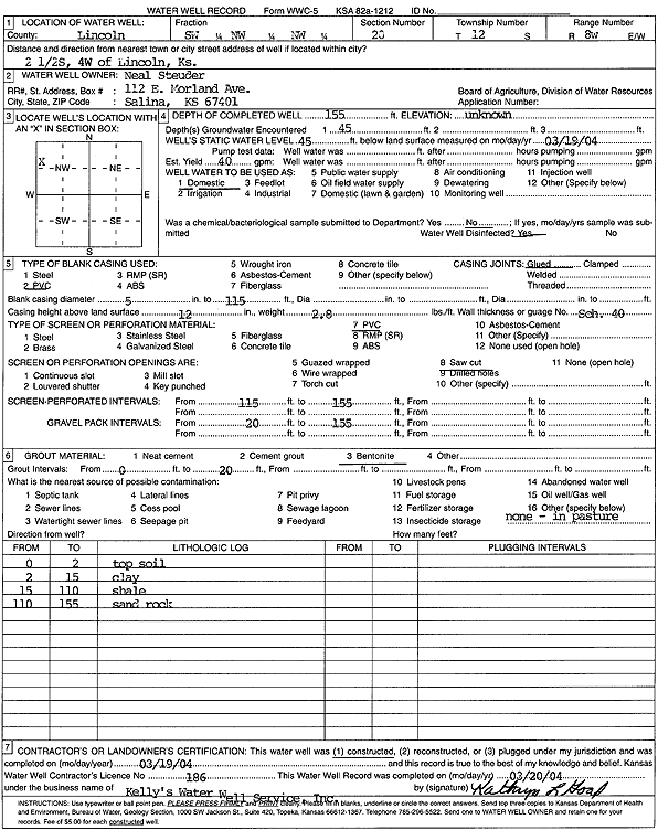 Steuder, Neal | 155 ft. | 45 ft. | 40 gpm. | Domestic | Constructed | 19-Mar-2004 | Scan | |