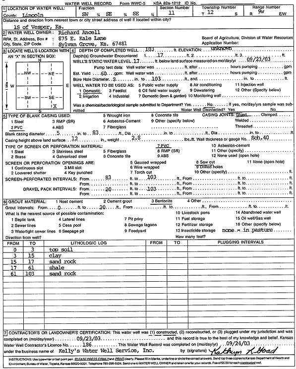 Ancell, Richard | 103 ft. | 17 ft. | 60 gpm. | Domestic | Constructed | 23-Sep-2003 | Scan | |