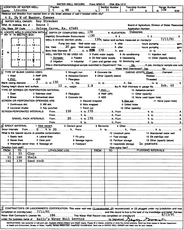 Strecker, Roy | 170 ft. | 130 ft. | 20 gpm. | Domestic | Constructed | 11-Jul-1991 | Scan | |
