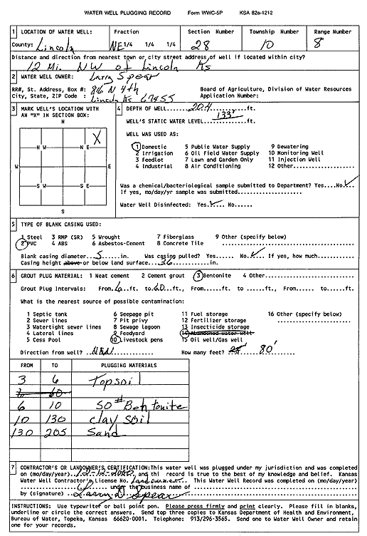 Spear, Larry | 204 ft. | 133 ft. | Domestic | Plugged | 12-Dec-2000 | Scan | ||