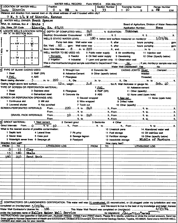 Spears, Frank | 240 ft. | 180 ft. | 60 gpm. | Domestic | Constructed | 29-May-1984 | Scan | |