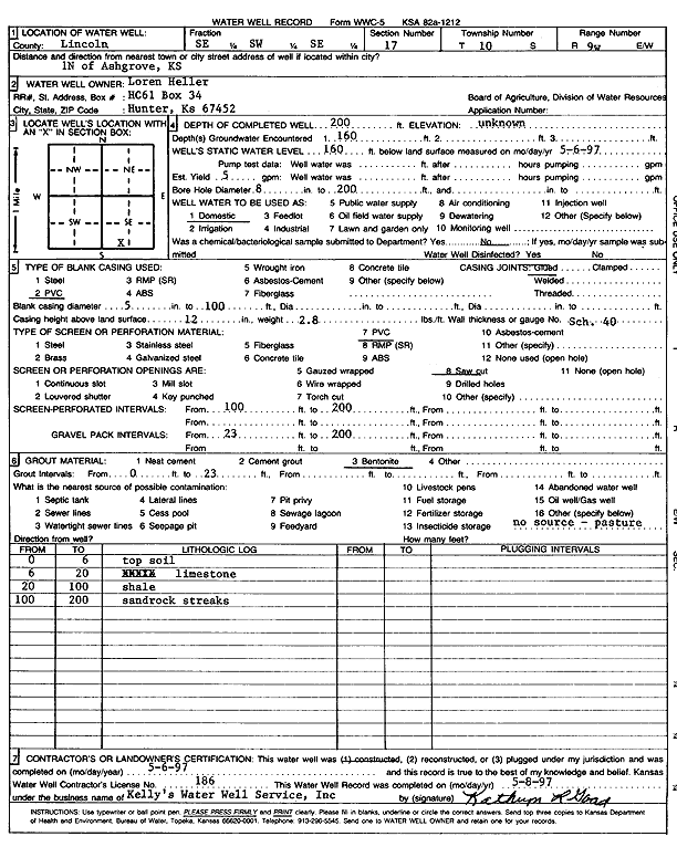 Hunter, Loren | 200 ft. | 160 ft. | 5 gpm. | Domestic | Constructed | 06-May-1997 | Scan | |