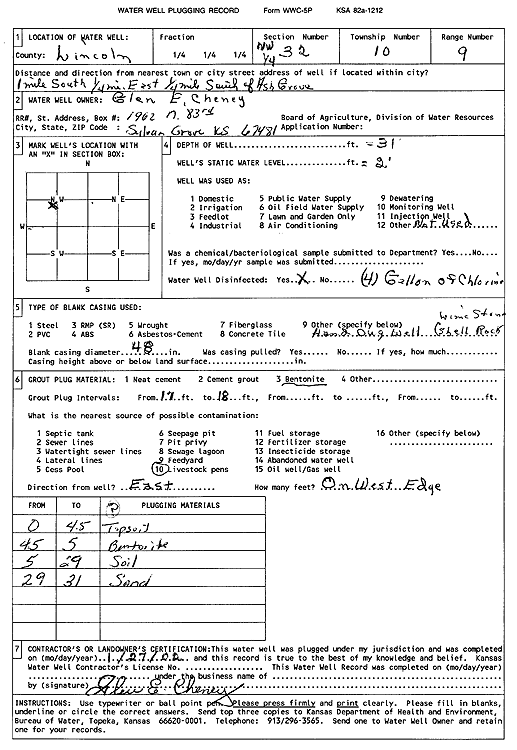 Cheney, Glen E. | 31 ft. | 2 ft. | (unstated)/abandoned | Plugged | 27-Jan-2002 | Scan | ||