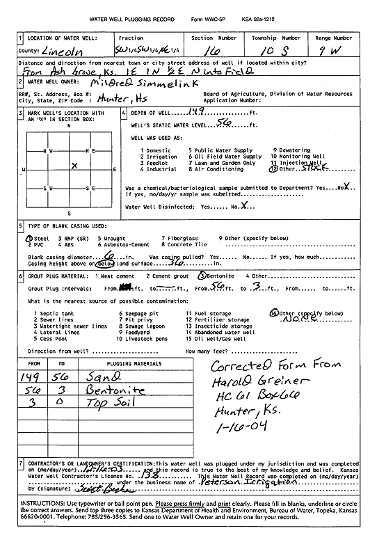 Simmelink, Mildred | 149 ft. | 56 ft. | Domestic, Livestock | Plugged | 16-Dec-2003 | Scan | ||