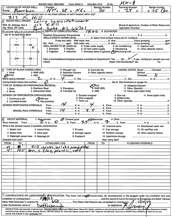 Petromark | 14.66 ft. | Monitoring well/observation/piezometer | MW 8 | Constructed | 19-Nov-2003 | Scan | ||