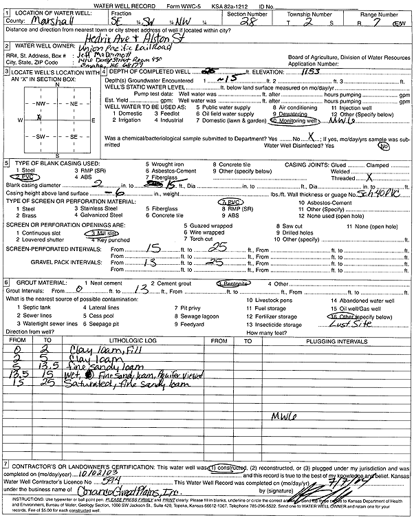 Kansas Dept. of Transportation | 12 ft. | (unstated)/abandoned | Plugged | 02-Jun-2003 | Scan | |||