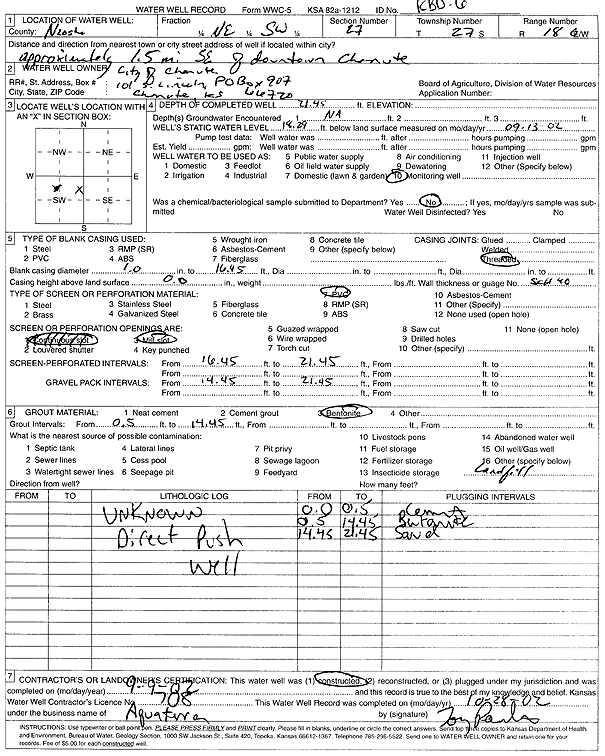 City of Chanute | 22.15 ft. | 18.6 ft. | Monitoring well/observation/piezometer | RBD 10 | Constructed | 09-Sep-2002 | Scan | |