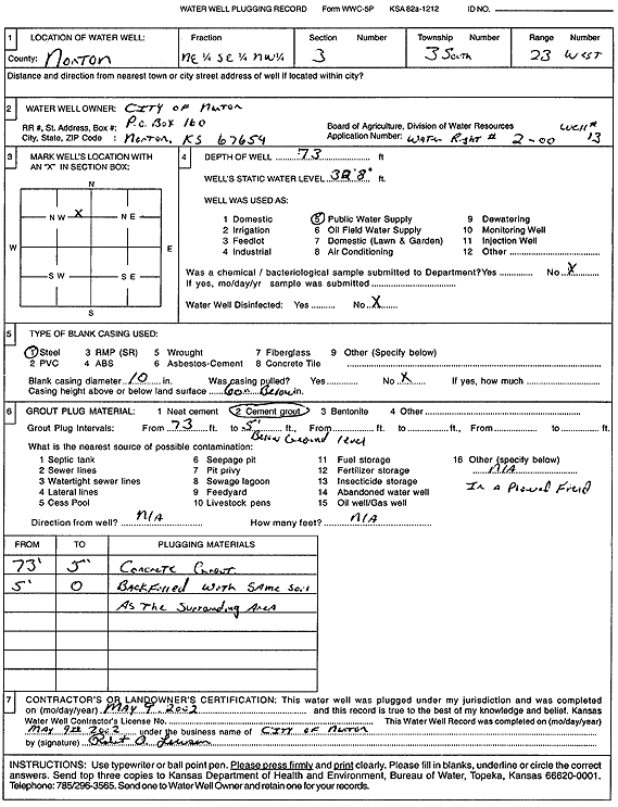 City of Norton | 73 ft. | 32.67 ft. | Public Water Supply | Well 13 | Plugged | 09-May-2002 | Scan | |