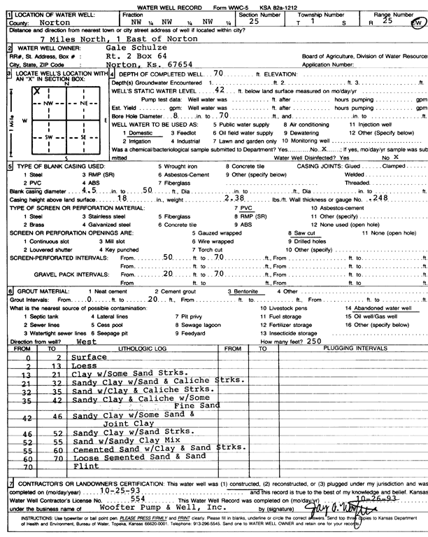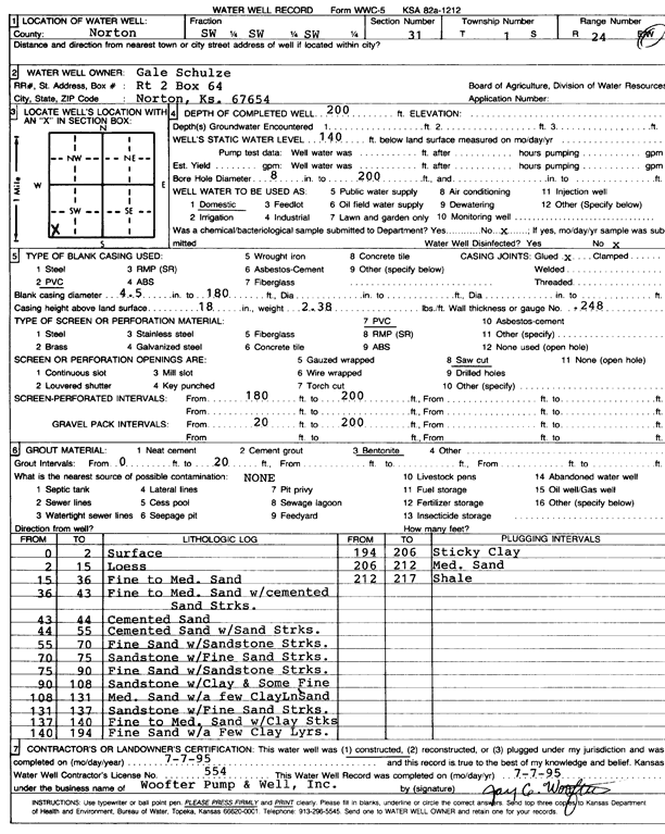 Schulze, Gale | 200 ft. | 140 ft. | 8 gpm. | Domestic | Constructed | 07-Jul-1995 | Scan | |