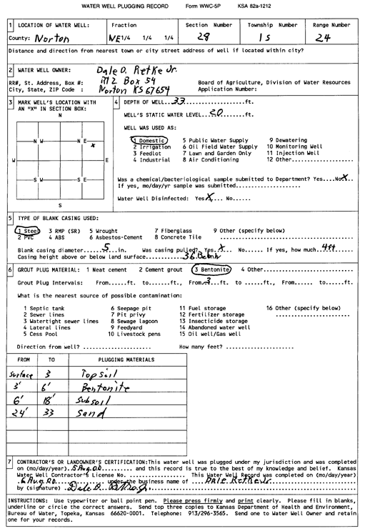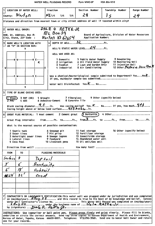 Retke, Dale O., Jr. | 32 ft. | 24 ft. | Domestic, Livestock | Plugged | 05-Aug-2000 | Scan | ||
