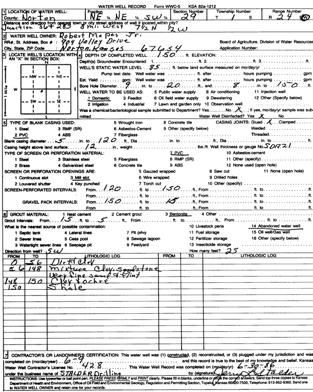Skrdlant, Walter | 152 ft. | 90 ft. | 18 gpm. | Domestic, Livestock | Constructed | 19-Aug-2017 | ||