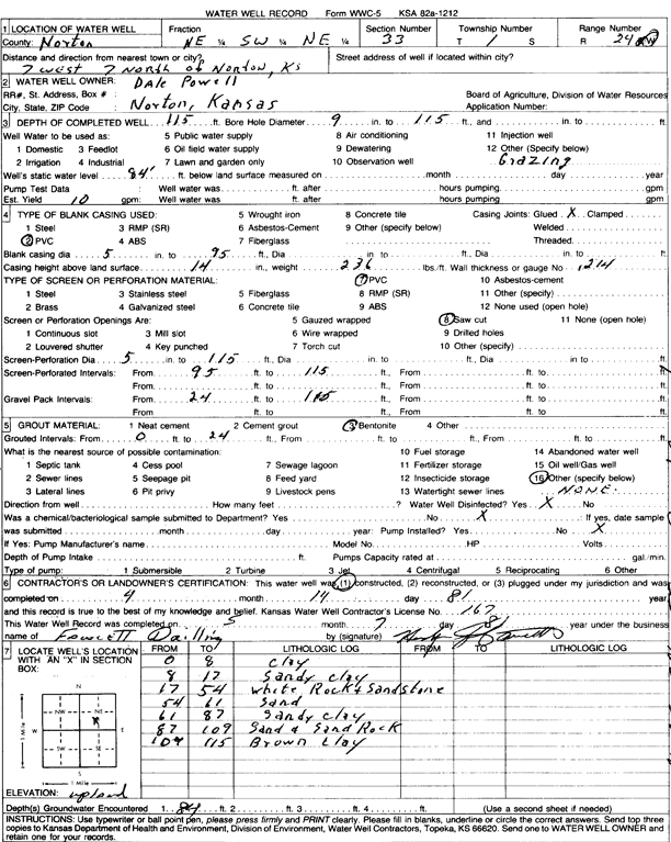 Powell, Dale | 115 ft. | 84 ft. | 10 gpm. | Domestic, Livestock | Constructed | 14-Apr-1981 | Scan | |