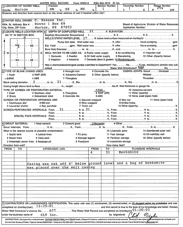C. Kasson, Inc. | 31 ft. | 27 ft. | Monitoring well/observation/piezometer | Plugged | 20-Dec-2001 | Scan | ||