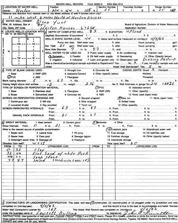 Yunt, Glenn | 83 ft. | 44 ft. | 20 gpm. | Domestic | Constructed | 05-Apr-1982 | Scan | |