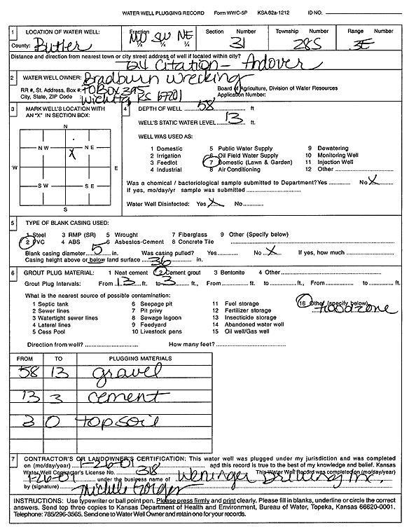 Bradburn Wrecking | 58 ft. | 13 ft. | Domestic, Lawn and Garden | Plugged | 26-Jan-2001 | Scan | ||