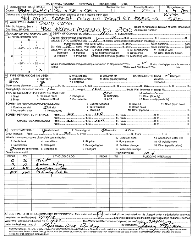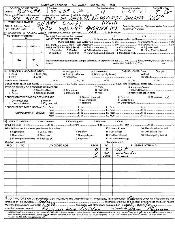 Sharp Construction | 100 ft. | (unstated)/abandoned | Plugged | 15-Sep-2003 | Scan | |||