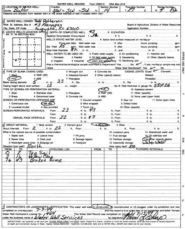 Patterson, Todd | 43 ft. | 25 gpm. | Domestic, Lawn and Garden | Constructed | 07-Jul-1999 | Scan | ||