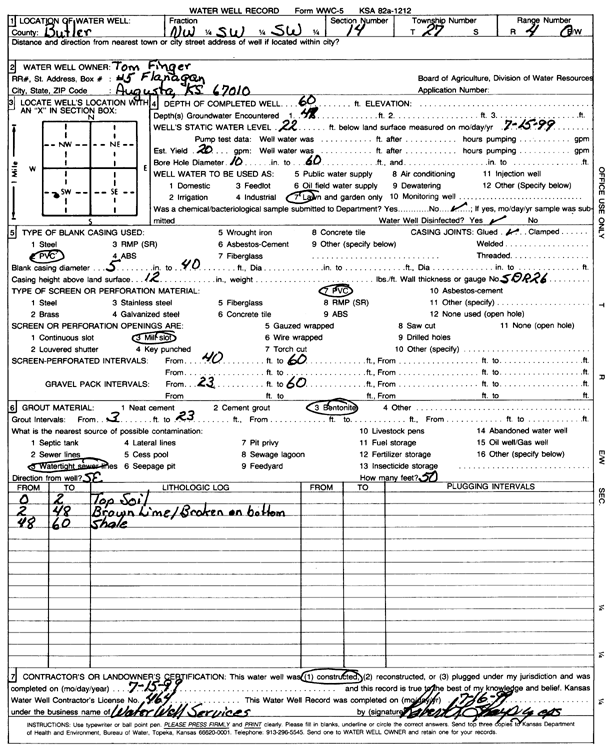 Finger, Tom | 60 ft. | 22 ft. | 20 gpm. | Domestic, Lawn and Garden | Constructed | 15-Jul-1999 | Scan | |