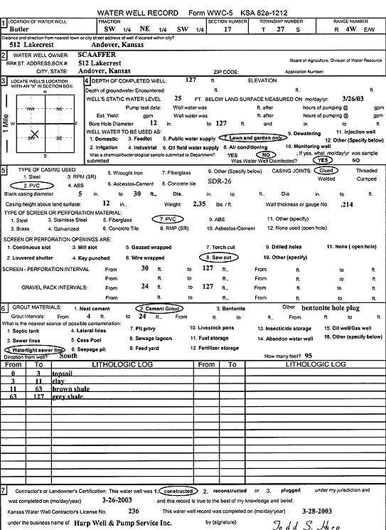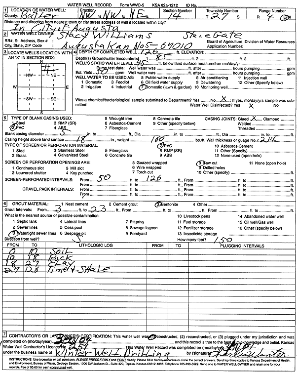 Williams, Stacy | 126 ft. | 45 ft. | 50 gpm. | Domestic, Lawn and Garden | Constructed | 23-Mar-2004 | Scan | |