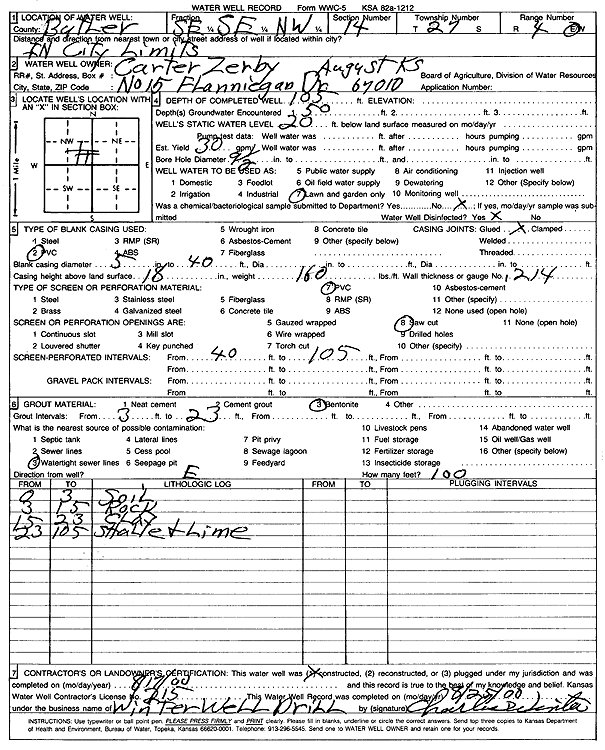 Zerby, Carter | 105 ft. | 20 ft. | 30 gpm. | Domestic, Lawn and Garden | Constructed | 17-Aug-2000 | Scan | |