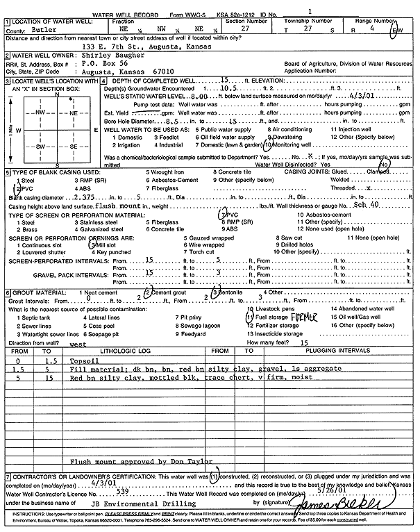 Baugher, Shirley | 15 ft. | 8 ft. | Monitoring well/observation/piezometer | Well 1 | Constructed | 03-Apr-2001 | Scan | |