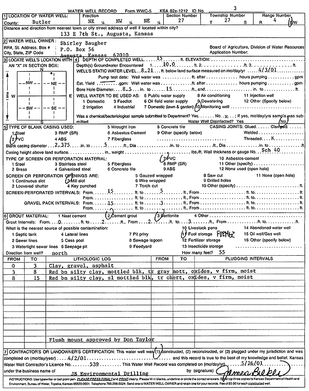 Baugher, Shirley | 15 ft. | 8.21 ft. | Monitoring well/observation/piezometer | Well 3 | Constructed | 02-Apr-2001 | Scan | |
