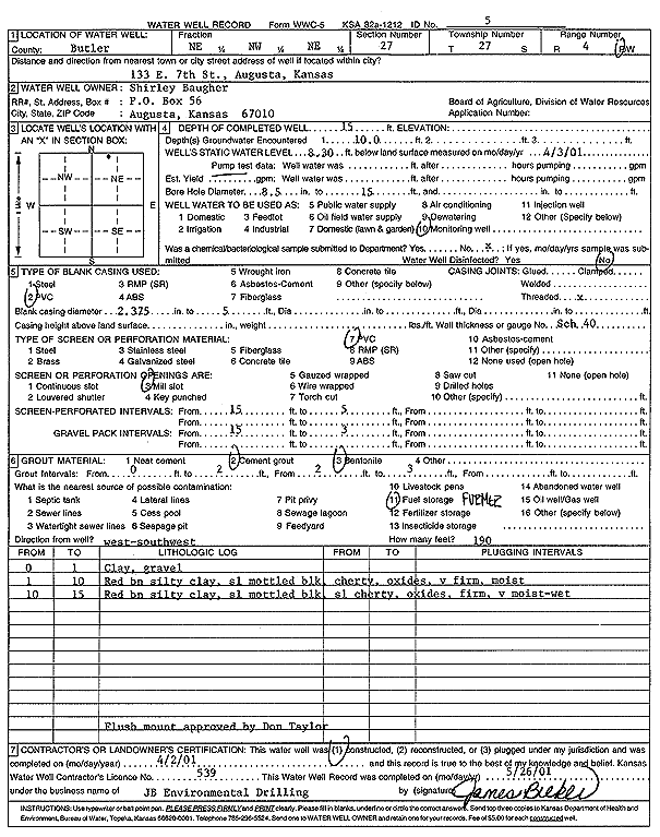 Baugher, Shirley | 15 ft. | 8.3 ft. | Monitoring well/observation/piezometer | Well 5 | Constructed | 02-Apr-2001 | Scan | |