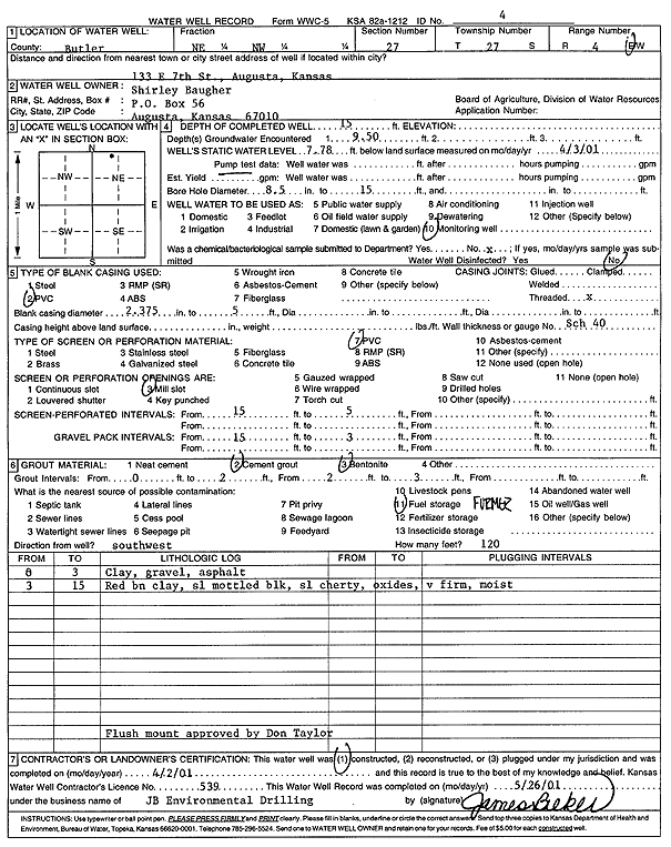 Baugher, Shirley | 15 ft. | 7.78 ft. | Monitoring well/observation/piezometer | Well 4 | Constructed | 02-Apr-2001 | Scan | |