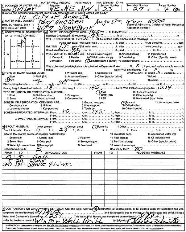 Nuessen, Tony | 145 ft. | 35 ft. | 15 gpm. | Domestic, Lawn and Garden | Constructed | 10-Feb-2002 | Scan | |