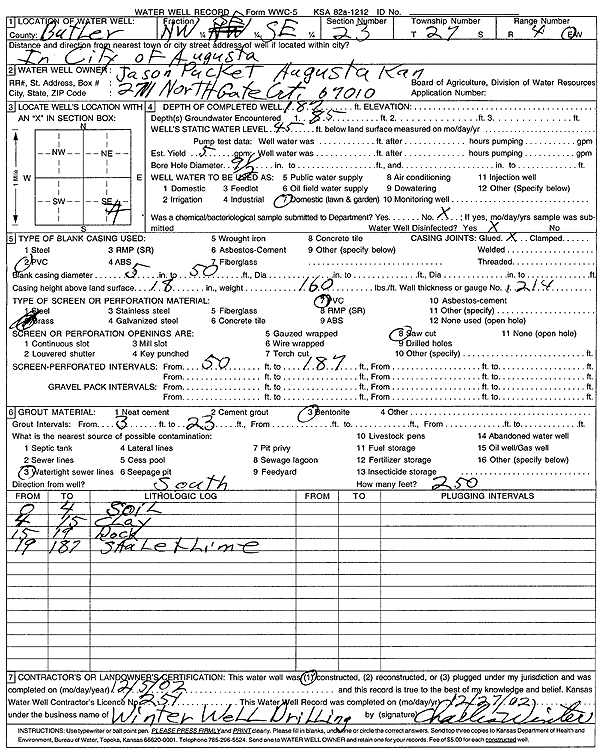 Pucket, Jason | 187 ft. | 45 ft. | 5 gpm. | Domestic, Lawn and Garden | Constructed | 05-Dec-2002 | Scan | |