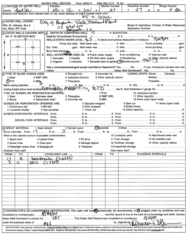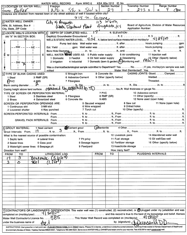 City of Augusta-Water Treatment Plant | 17 ft. | 4.3 ft. | Monitoring well/observation/piezometer | Plugged | 24-Apr-2000 | Scan | ||