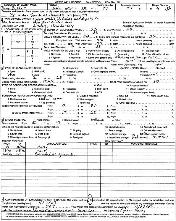 Exxon Mobil Refining and Supply Co. | 23 ft. | Monitoring well/observation/piezometer | Constructed | 07-Apr-2003 | Scan | |||