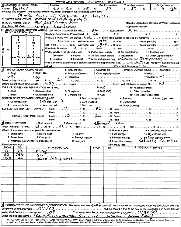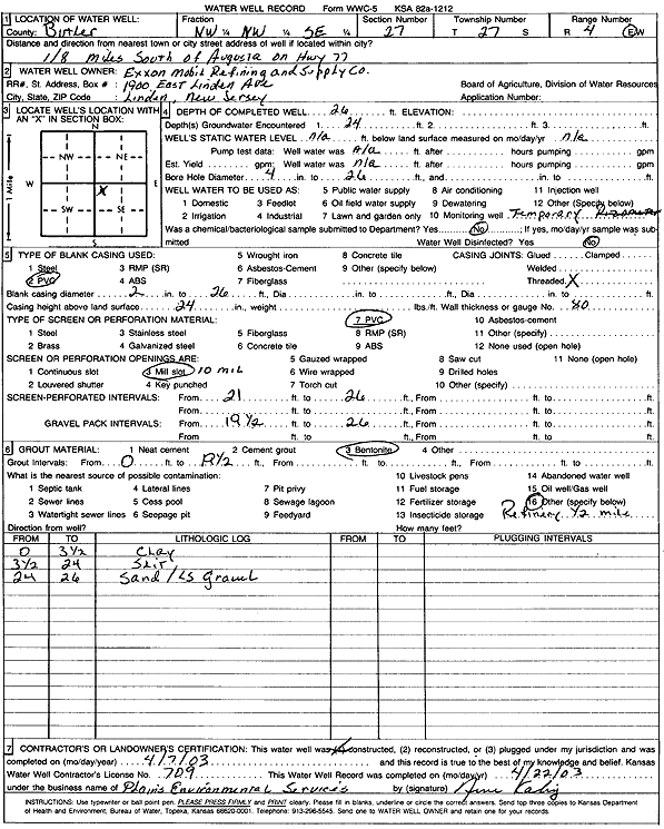 Exxon Mobil Refining and Supply Co. | 26 ft. | Monitoring well/observation/piezometer | Constructed | 07-Apr-2003 | Scan | |||