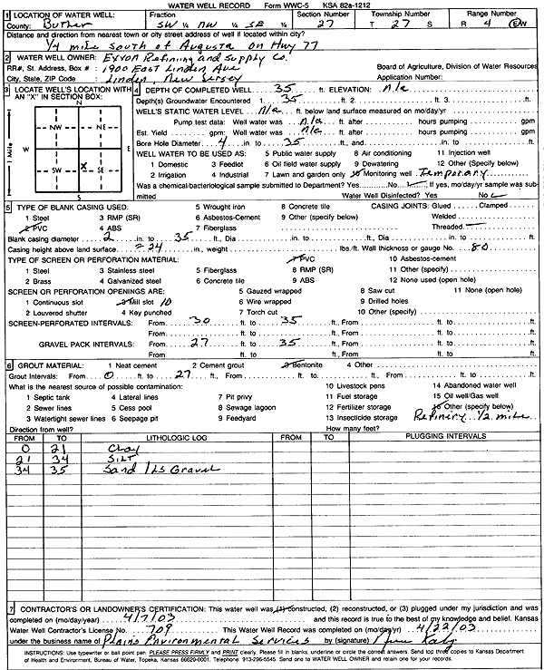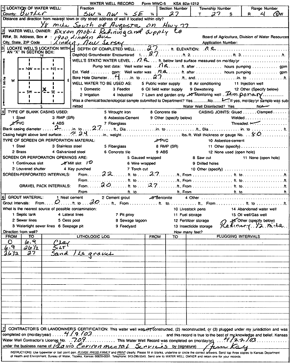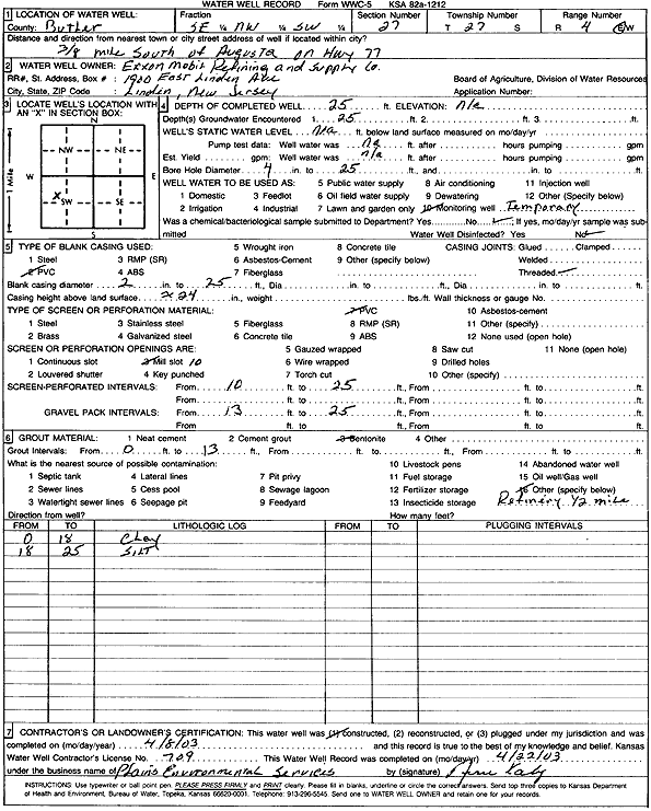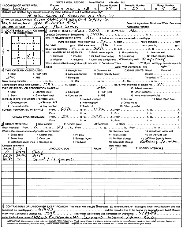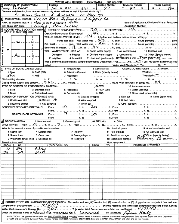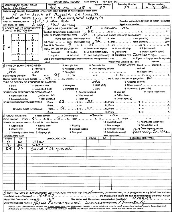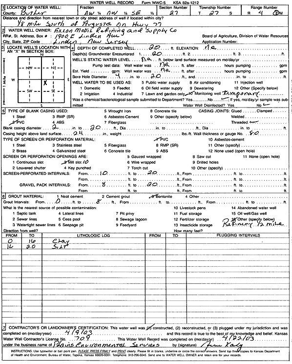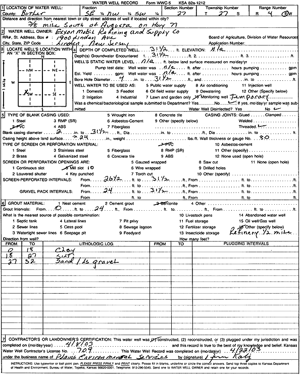 Exxon Mobil Refining and Supply Co. | 27 ft. | Monitoring well/observation/piezometer | Constructed | 09-Apr-2003 | Scan | |||