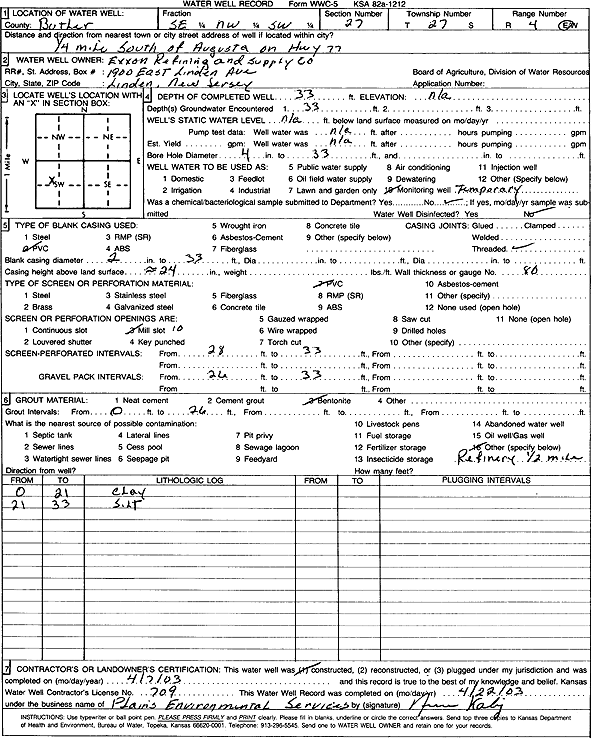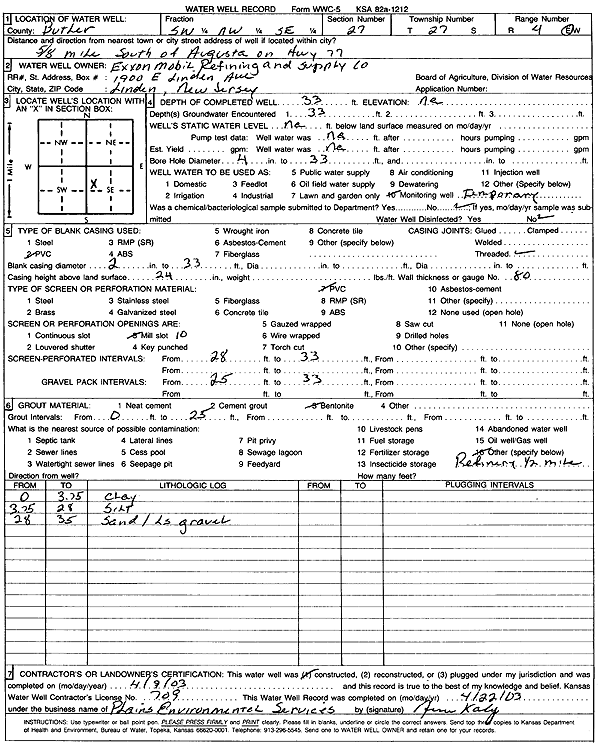 Exxon Mobil Refining and Supply Co. | 33 ft. | Monitoring well/observation/piezometer | Constructed | 07-Apr-2003 | Scan | |||