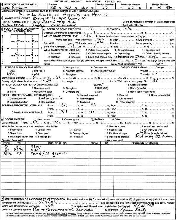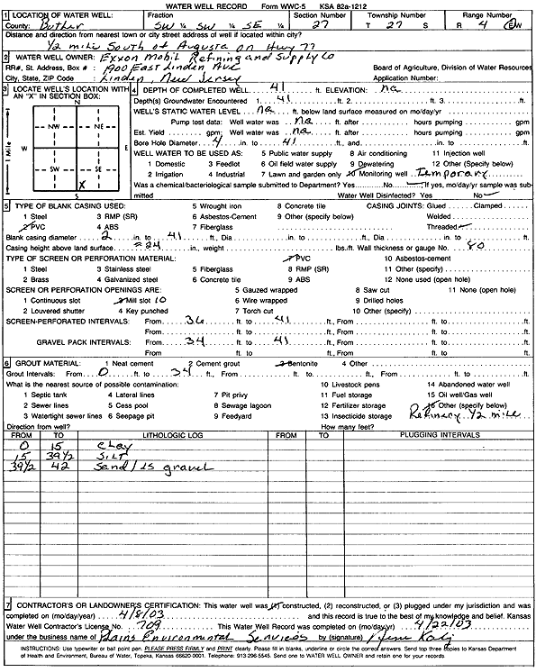 Exxon Mobil Refining and Supply Co. | 41 ft. | Monitoring well/observation/piezometer | Constructed | 08-Apr-2003 | Scan | |||