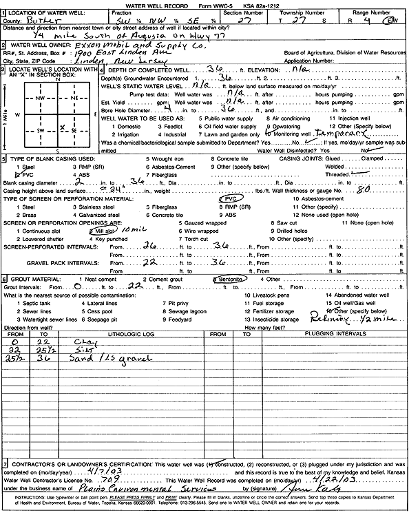 Exxon Mobil Refining and Supply Co. | 36 ft. | Monitoring well/observation/piezometer | Constructed | 07-Apr-2003 | Scan | |||