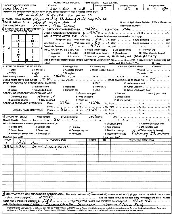 Exxon Mobil Refining and Supply Co. | 37 ft. | Monitoring well/observation/piezometer | Constructed | 08-Apr-2003 | Scan | |||