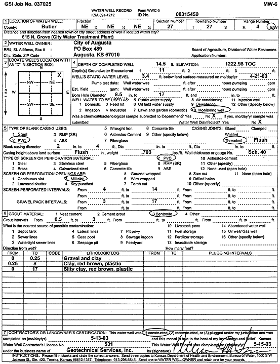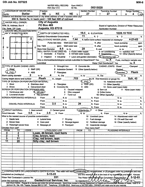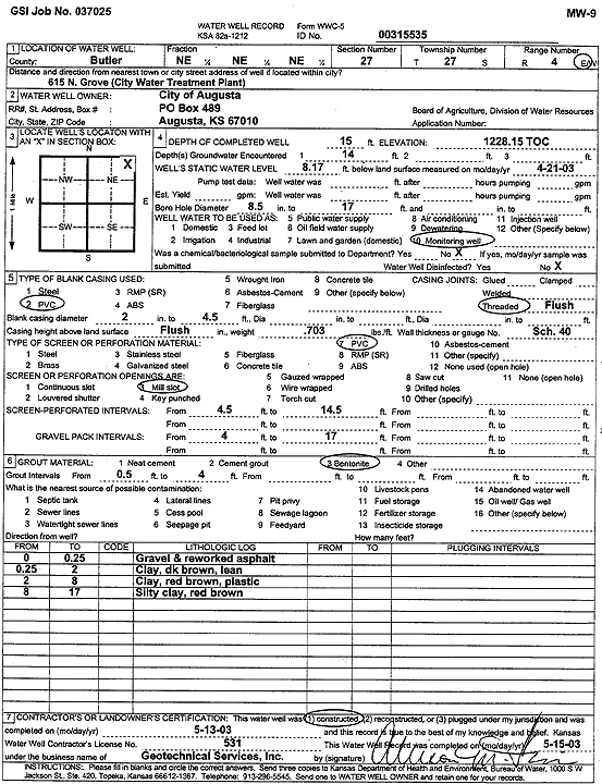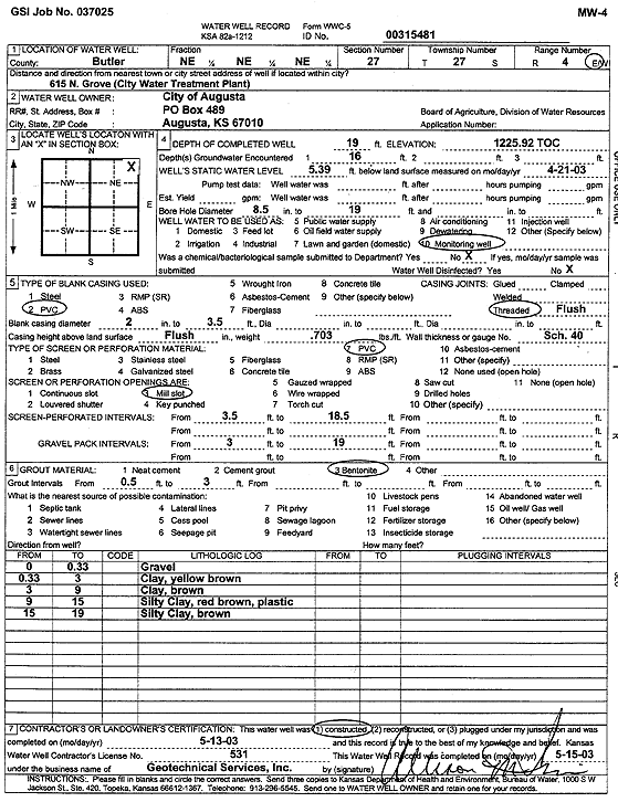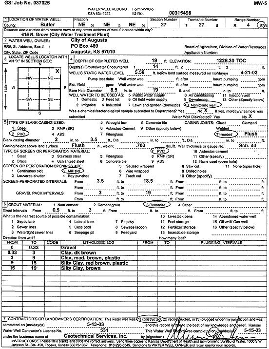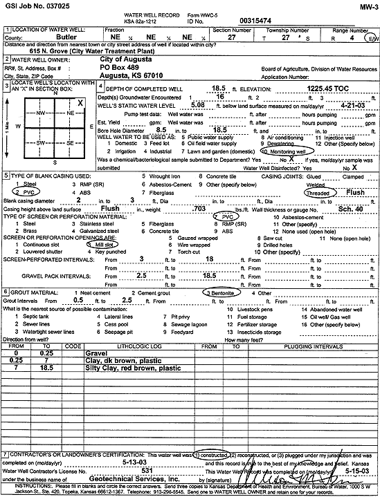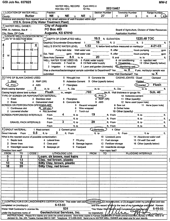 City of Augusta | 19 ft. | 5.58 ft. | Monitoring well/observation/piezometer | MW 5 | Constructed | 13-May-2003 | Scan | |
