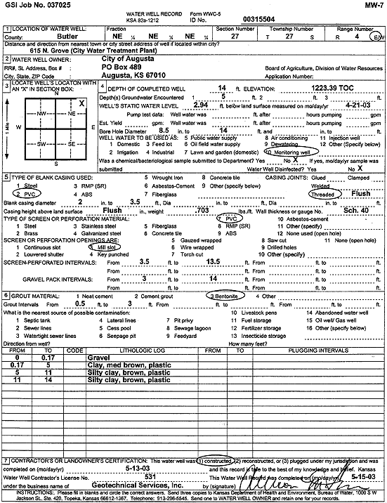City of Augusta | 14 ft. | 2.94 ft. | Monitoring well/observation/piezometer | MW 7 | Constructed | 13-May-2003 | Scan | |