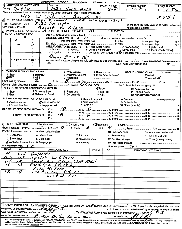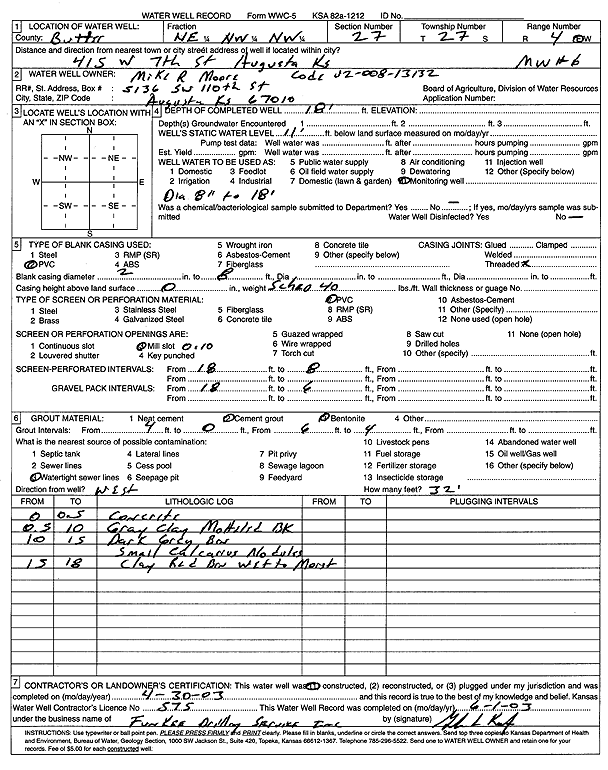 Moore, Mike R. | 18 ft. | 11 ft. | Monitoring well/observation/piezometer | MW 1 | Constructed | 30-Apr-2003 | Scan | |
