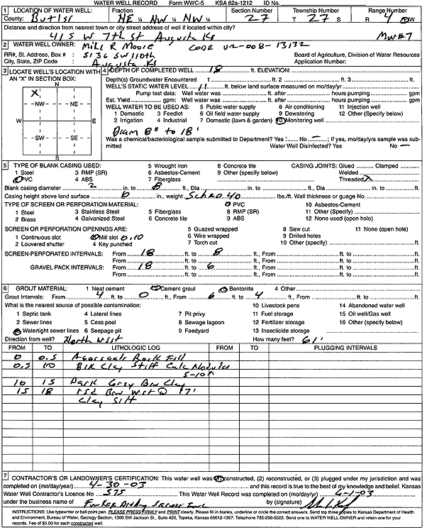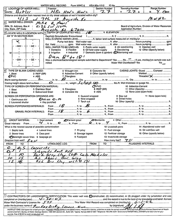 Moore, Mike R. | 18 ft. | 11 ft. | Monitoring well/observation/piezometer | MW 7 | Constructed | 30-Apr-2003 | Scan | |