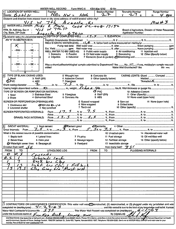 Moore, Mike R. | 17.5 ft. | 11 ft. | Monitoring well/observation/piezometer | MW 3 | Constructed | 29-Apr-2003 | Scan | |