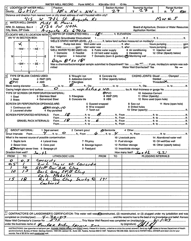 Moore, Mike R. | 18 ft. | 11 ft. | Monitoring well/observation/piezometer | MW 5 | Constructed | 30-Apr-2003 | Scan | |