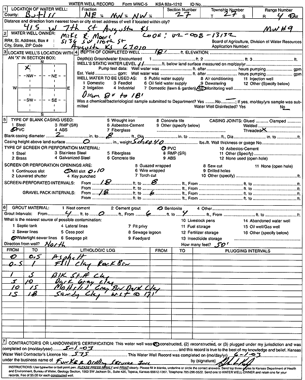 Moore, Mike R. | 18 ft. | 11 ft. | Monitoring well/observation/piezometer | MW 9 | Constructed | 01-May-2003 | Scan | |