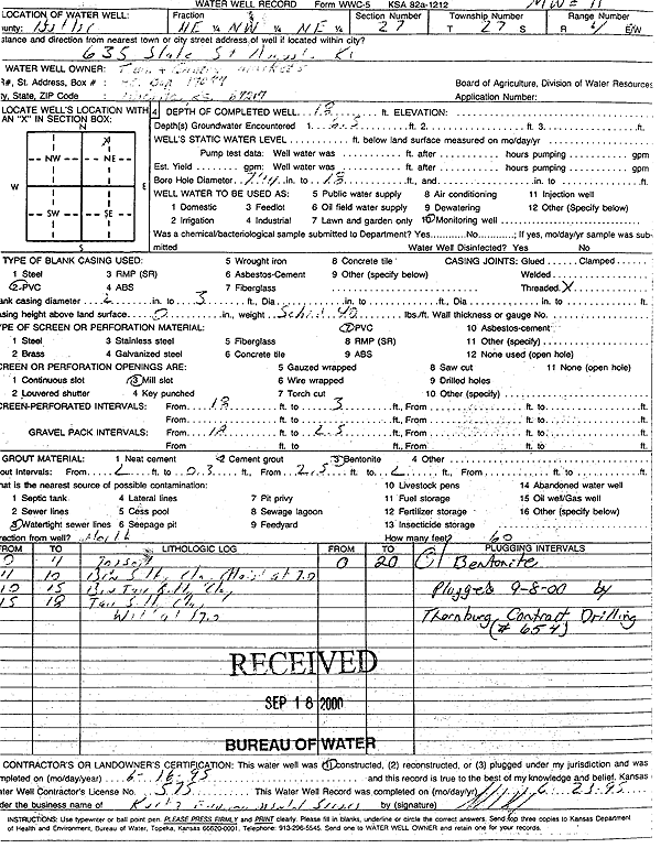 Town and Country Markets | 18 ft. | Monitoring well/observation/piezometer | MW 11 | Plugged | 08-Sep-2000 | Scan | ||